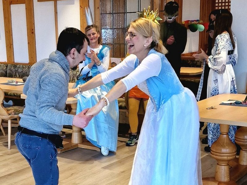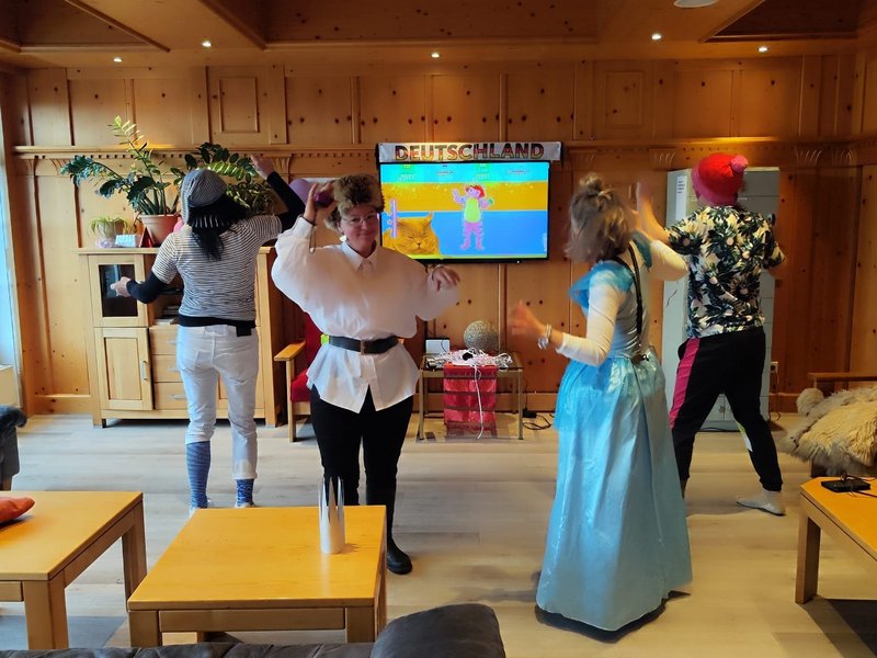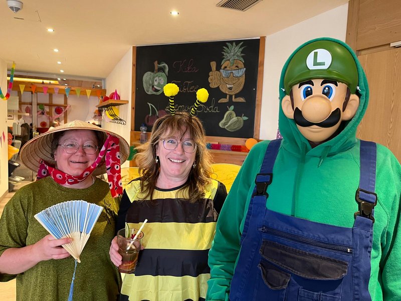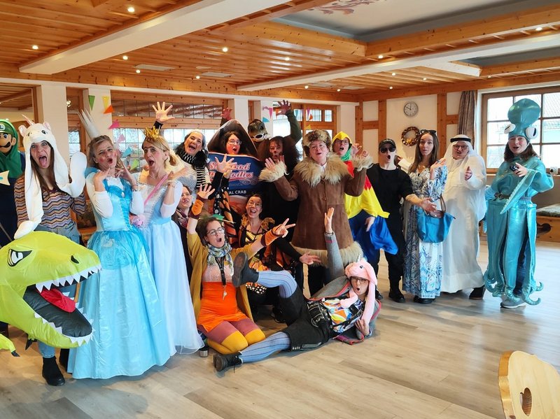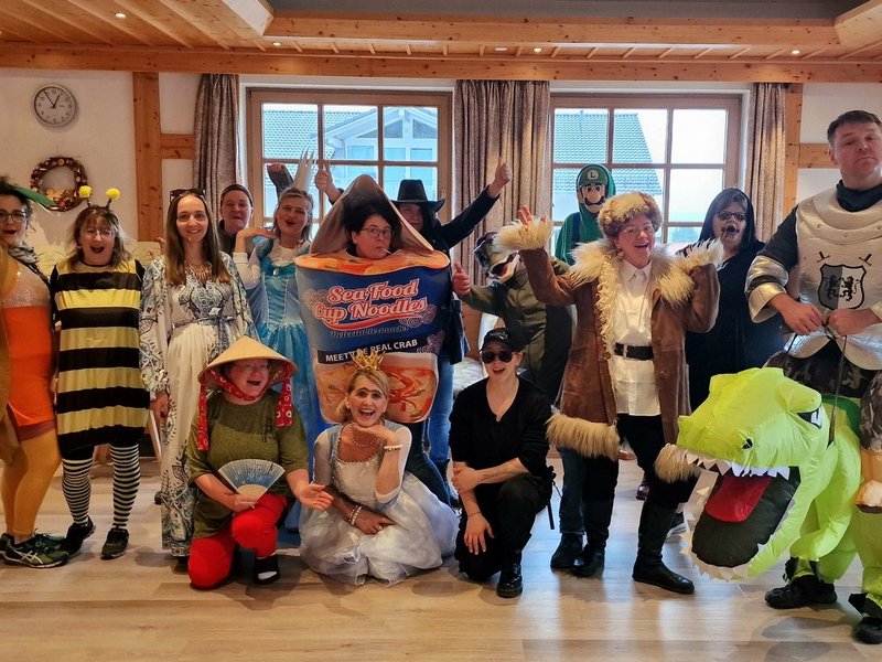 Die Mitarbeiter/-innen kamen alle bunt-crazy verkleidet: als schönste Prinzessinnen, als Luigi, als Nudlsuppn (Ramen), als Personenschützerin, als A-Promi, als Echse/Dino, als Ritter, als Papagei, als Oktopus, als Schah, als Biene, als Hund ... und, und, und ...
