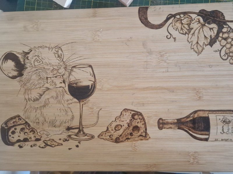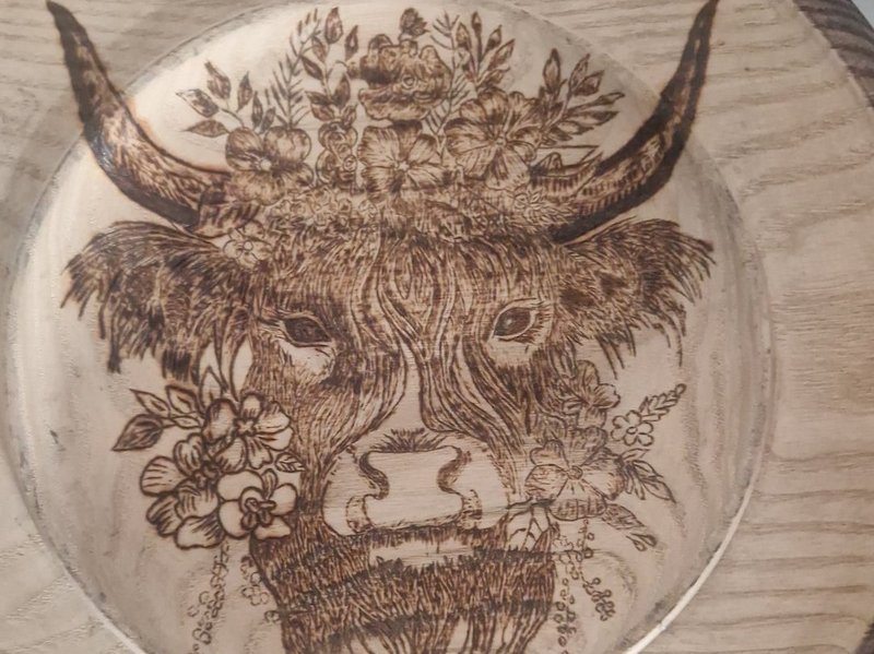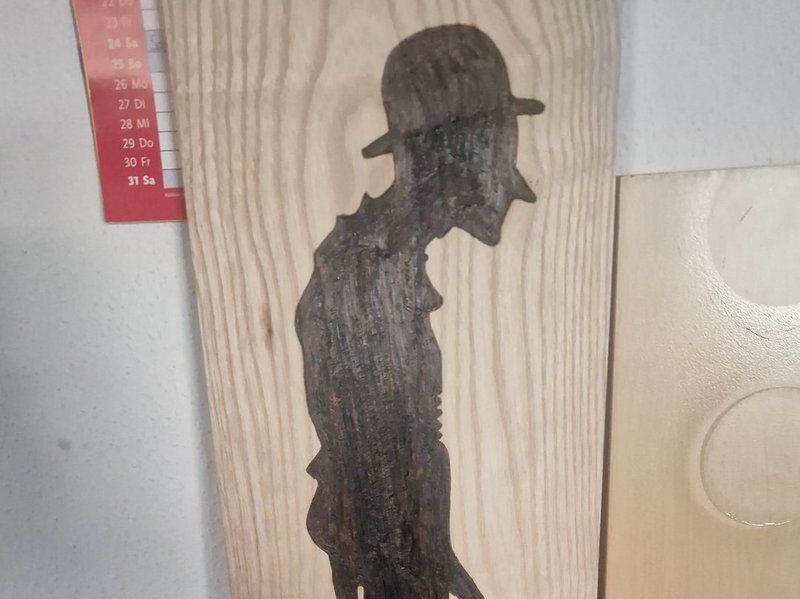 Mit dem "Brennpeter" zeichnet er Motive auf Holzstücke: Teller, Holzplatten, Tabletts, Pizzaschieber usw.