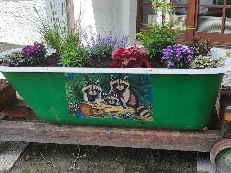 Während der Arbeitsangebote unseres Hauses wird das Thema Recycling in unserem Garten richtig kreativ umgesetzt! Aus einer alten Badewanne und einem antiken Rollwagen ist ein blühendes Kunstwerk entstanden. Unser Bewohner Herr P. hat sich als Gartendesigner betätigt – und das Ergebnis lässt alle staunen: ein Beet, das nicht nur die Pflanzen, sondern auch die Fantasie zum Blühen bringt. Wer hätte gedacht, dass ausrangierte Alltagsgegenstände dank Kreativität und Ideenreichtum so dekorativ sein können?